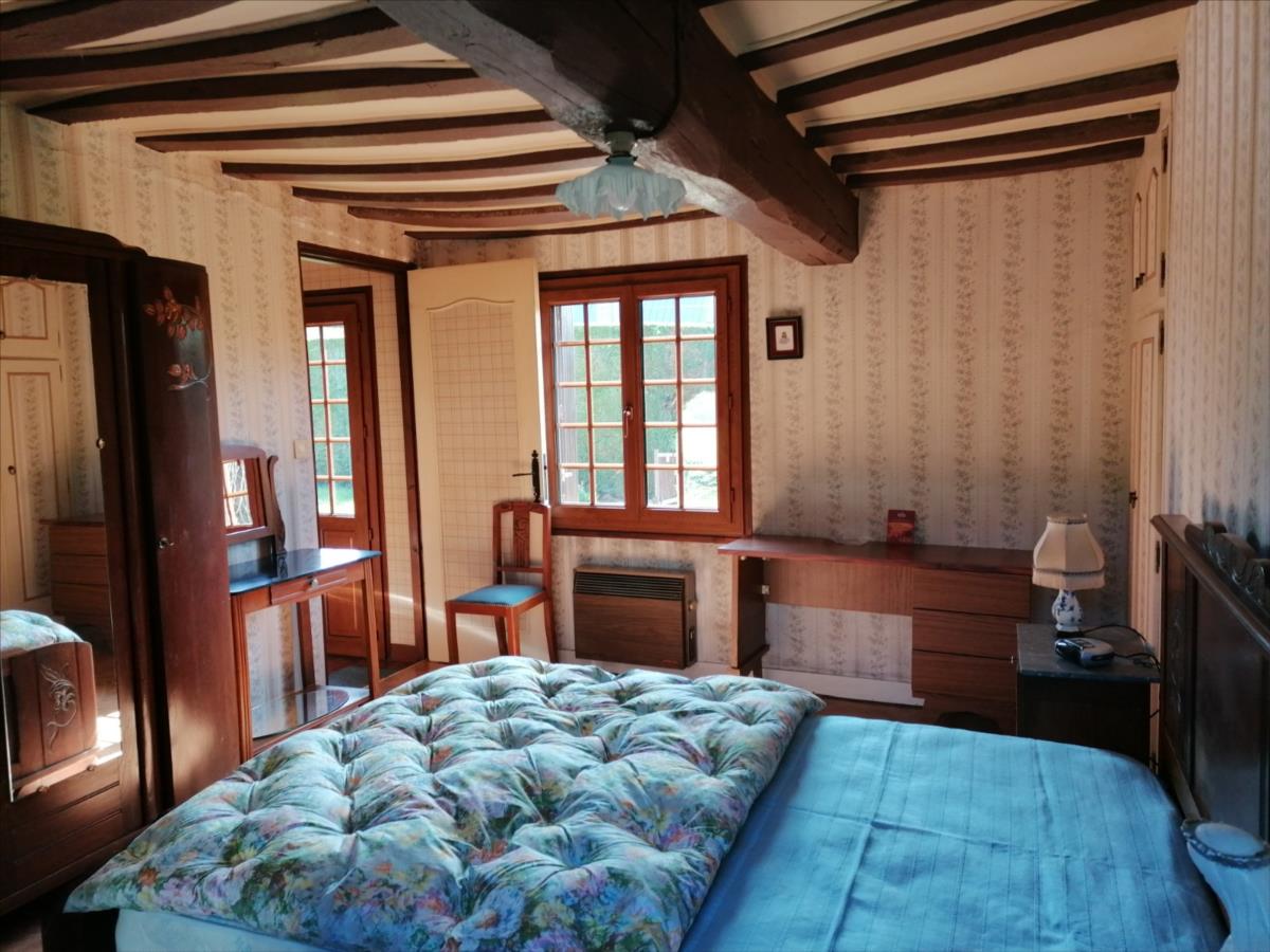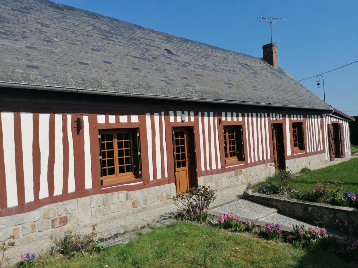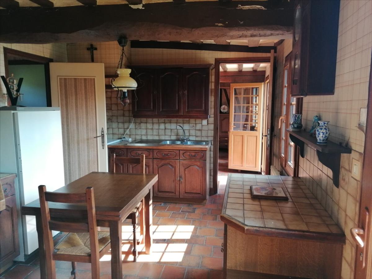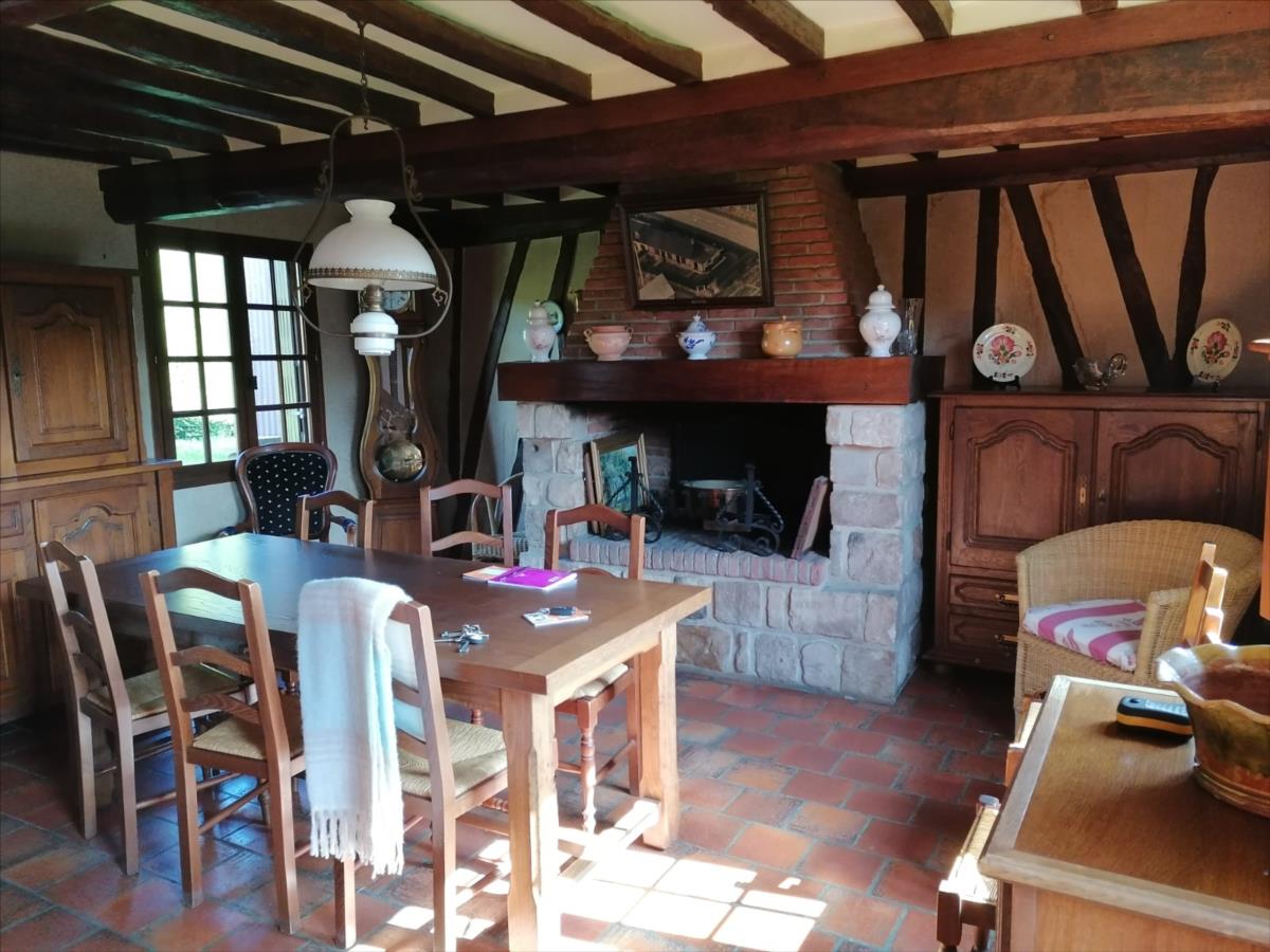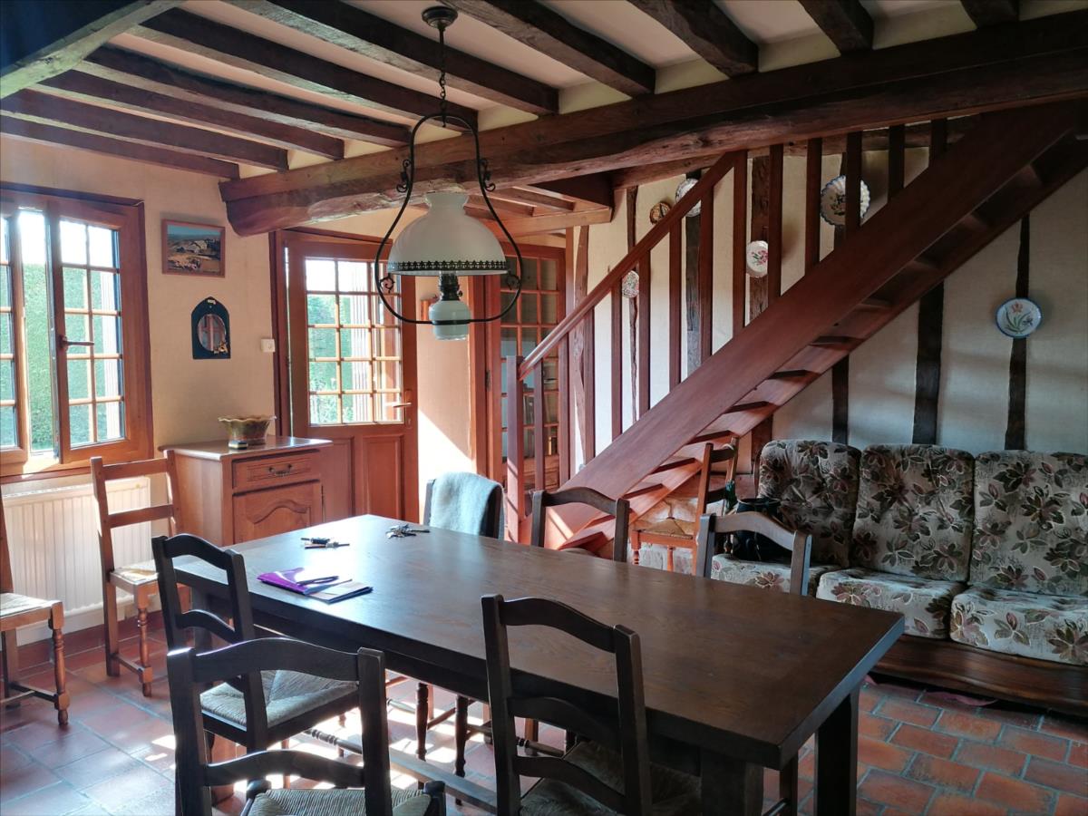 Maison Normande 2 Pièces principales d'une surface habitable d'environ 60 m² comprenant de plain-pied : entrée sur cuisine équipée, séjour avec cheminée, une chambre, salle de bains, WC; atelier / débarras d'environ 17 m² (accès extérieur); grenier potentiellement aménageable au-dessus; Sur jardin 520 m² Logement à consommation énergétique excessive